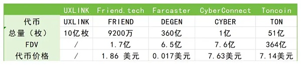 UXLINK总量10亿枚计算,与部分已发币的SocialFi项目进行横比,如下