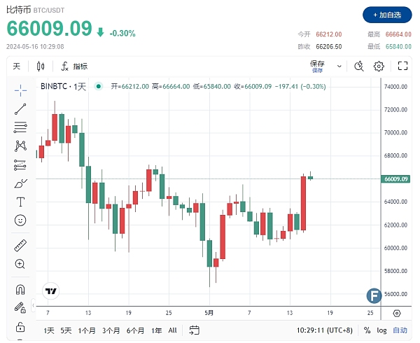 周四(5月16日),比特币继续在66000美元上方震荡,隔夜交易区间一度飙涨超过5100美元,大举清算5万名空头交易员。美国消费者物价指数(CPI)显示通胀放缓,市场解读为美联储可能维持宽松货币政策的信号。