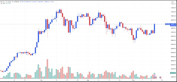 TradingView提供的数据显示,比特币周三交易处于上涨模式,下午从61315美元的低点一度飙升至66420美元的高点,多头没有显示出放缓上涨势头的迹象。