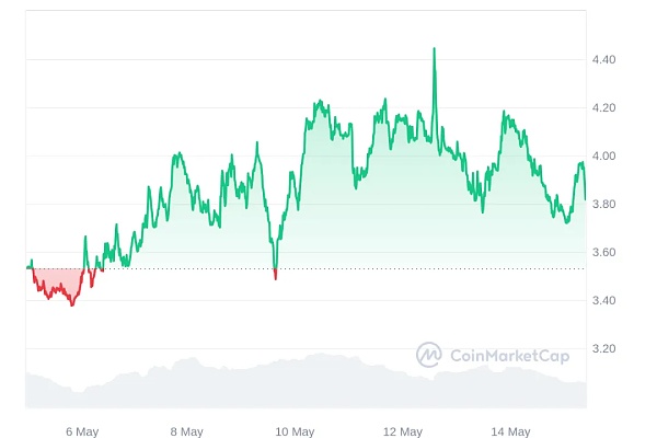 在过去的六个月里,Jito的价格大幅上涨了176.55%,表明其价值呈强劲上涨趋势。仅本周,它就小幅上涨了 1.45%,目前其价格在 3.36 美元至 4.44 美元之间波动。与上个月相比,Jito 的价值上涨了 27.77%。