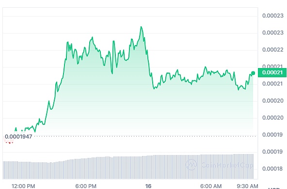 在此期间,Floki Inu 的价格在过去 24 小时内上涨了 12.36%,在当前交易中达到 0.0002134 美元。加密货币交易量同期飙升 320.12% 至 5.1894 亿美元,推动了积极的市场情绪。