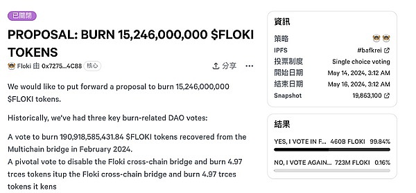 另外,热门迷因币专案Floki 在周二(14)也针对燃烧152.4 亿枚FLOKI 代币的提案进行社群投票,并在今(16)日以99.84% 赞成率通过提案。