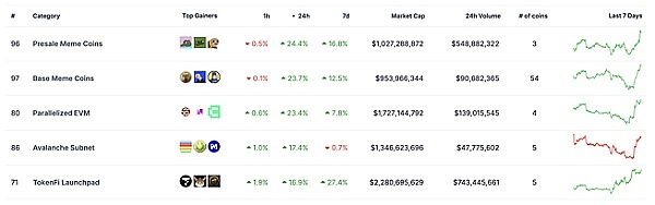 其中,迷因类代币接续前日的涨幅,在近24 小时中表现尤为亮眼。根据Coingecko数据,Presale Meme、Base Meme 类别代币在近24 小时涨幅排行中,分别占据第一、第二位,分别上涨24.4%、23.7%。