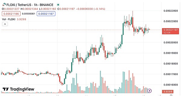 据Tradingview数据显示,FLOKI 价格自提案提出后一度触及0.00023 美元高点,截稿前回落至0.0002115 美元,近24 小时上涨7.9%,三天时间最高跳涨45 %。