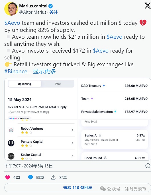 具体来说,Aevo 团队目前持有价值 1.25 亿美元的 AEVO,他们可能随时出售这些资产。同样,主要投资者获得的 172 美元AEVO 也准备出售。Aevo 社区感到受伤并感到被背叛。