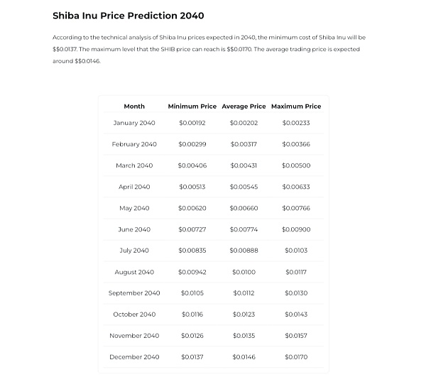 在同一篇文章中,分析师预测,随着时间的推移,柴犬将飞升至更高的高度。他们预计 SHIB 到 2040 年 1 月将再清除一个零,但只会在 2040 年 2 月达到 0.003 美元的价格区域,预计其交易平均价格为 0.00317 美元。