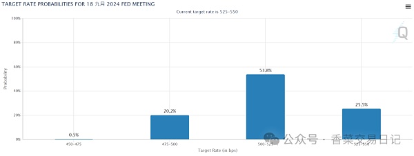 而在9 月维持当前利率不变的机率仅25.5%,降息一码的机率达53.8%。