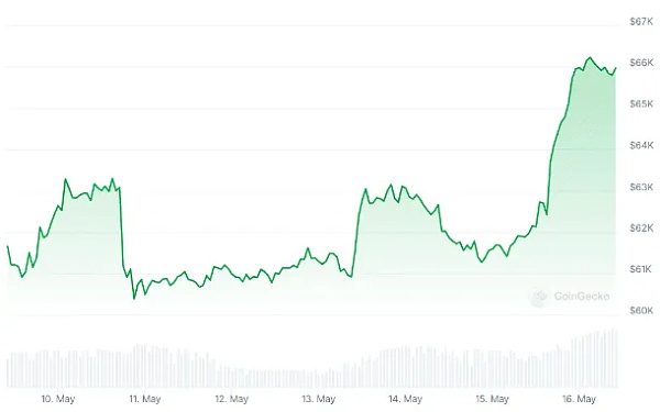 经过过去几天的横盘整理后,主要加密货币的价格 在 5 月 15 日再次上涨 。几个小时内从 61,500 美元飙升至 66,500 美元以上, 目前约为 66,000 美元。