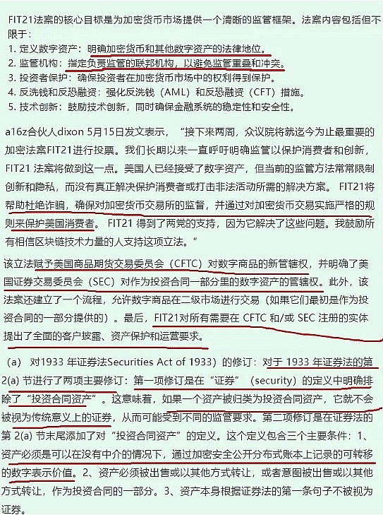 从披露的数据显示,有几个重点:1,这个法案是被两党支持的,所以大概率都是会通过的。2,法案定义了明确的监管机构:CFTC和SEC,确立了执法权。3,修改了证劵法,明确区分了“证券"和“投资合同资产”的区别,也就是普通代币和证券代币的区别。另外也对“投资合同资产”进行了定义,以便于区分”证券代币"。总之,如果以前由于加密货币是创新行业,可能法律条文解释不清晰,监管权力不规范,通过这次的法案签署后,对加密货币的监管将会变得更加容易。以后可能就不会出现,“起诉XRP失败”,“被灰度成功起诉“等等的问题了。