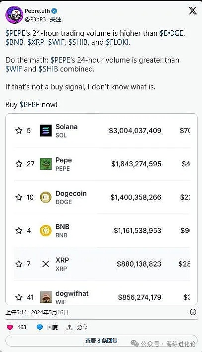 PEPE币登顶24小时交易 超越WIF、SHIB和XRP