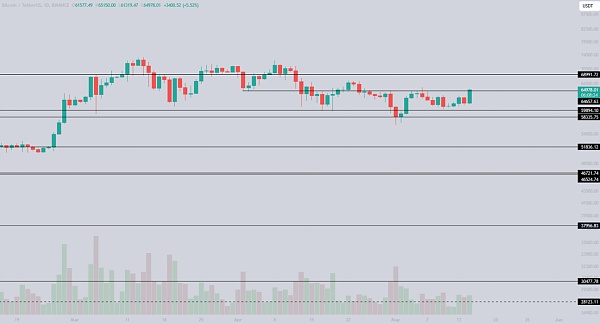 他表示:「自 5 月初以来,比特币一直在 6 万美元的周支撑位和 6.4 万美元的日阻力位之间波动。」 「从日线图上看,我们可以看到形成了一个更高的低点,在撰写本文时,比特币的交易价格略低于日阻力位。」