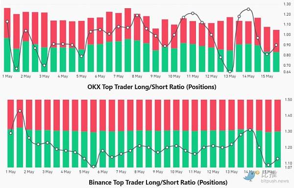 image.pngCoinglass 数据显示,在 OKX,目前多空比率为 0.96,表明多头和空头的持仓大致相等。然而,与 5 月 14 日相比,这一立场不太乐观,当时该指标为 1.25,有利于多头。同样,与 5 月 14 日相比,币安顶级交易员现在的看涨情绪有所减弱,多空比率从 1.31 降至 1.14。