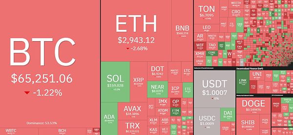 昨日 CPI 驱动的上涨势头消退,周四加密货币进入盘整模式。周四早盘,比特币主要在 61,000 美元的支撑位附近交易,然后在下午下滑至 65,000 美元的支撑位。 截至撰写本文时,BTC 交易价格为 65,215 美元,24 小时下跌 1.55%。