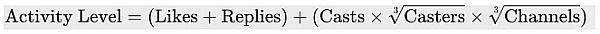 Activity Level:参与度(点赞+ 回复)加上推文次数乘以推文用户数和频道数的立方根。公式如下图: