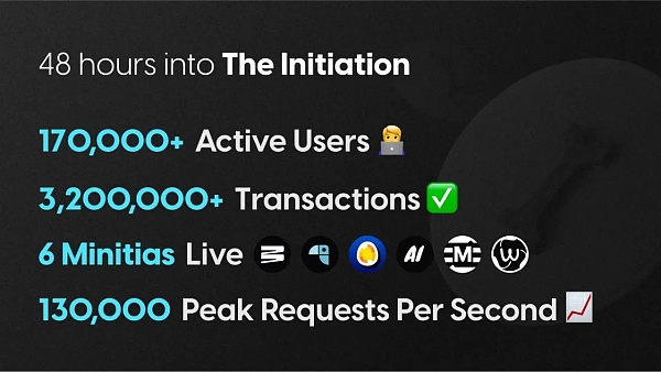 Initia 交互热度非常高,根据 Initia 官方 X 平台最新发布的数据显示,Initia 开放公共测试网的 48h 内,活跃用户超过 17 万,交易笔数超过 320 万。