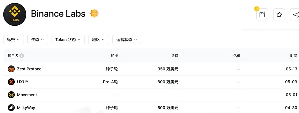 据 RootData 数据显示,Binance Labs 近半个月陆续投资了 Movement、Zest Protocol、UXUY、MilkyWay 多个早期项目,这些项目后续的交互机会也值得关注。