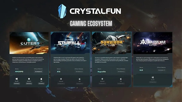 据悉,Crystal Fun有超过十款游戏的研发储备,其中不乏大IP作品。截至目前,Crystal Fun已完成研发的四款高品质Web3游戏分别是《Outer》、《Endless War》、《StarFall》和《Survivor》,这些游戏将经过社区用户多轮测试之后陆续推出。