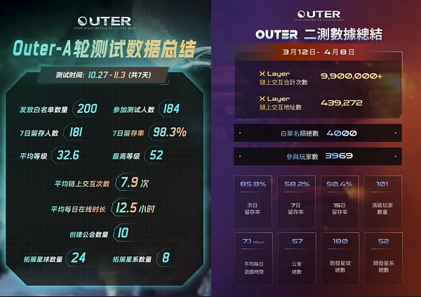 官方公布的《OUTER》测试统计数据表现亮眼,在去年10月底开始的为期7天的以太坊网络上白名单邀请仅200个名额的情况下,做到了98.3%的留存率、平均交互7.9次、平均日上线时间为12.5小时。随后今年3、4月份的二测在OKX平台发起的Xlayer测试网链上交互将近1000万次,一共消耗63284.5 OKB。
