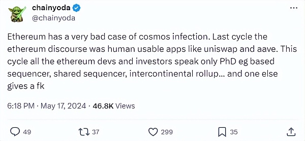 推特用户Chainyoda表示:“以太坊有一个非常糟糕的Cosmos感染案例,上个周期,以太坊讨论的是人类可用的应用程序,例如Uniswap和Aave。在这个周期中,所有以太坊开发者和投资者都只谈论基于序列器、共享序列器、洲际汇总。”