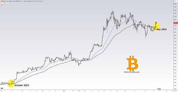 当短期移动平均线高于长期移动平均线时,就会出现黄金交叉。上次发生这种交叉是在 10 月份,就在接下来的四个月里,比特币从 30,000 美元以下反弹至接近 74,000 美元的新高之前。