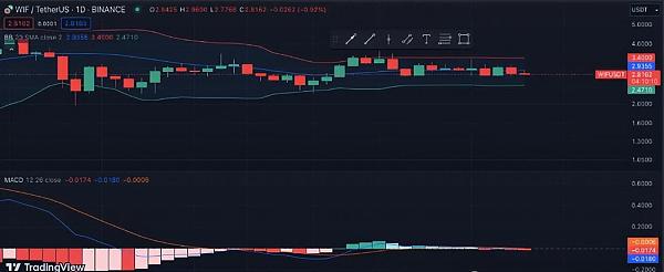 在24小时价格图表上,Dogwifhat(WIF)处于盘整期。价格变动被限制在一个狭窄的范围内,表明潜在的积累或分配阶段。布林带具有 20 周期 SMA,显示上轨线为 3.4000 美元,下轨线为 2.4710 美元。价格徘徊在 2.9355 美元的中间线附近,表明交易者之间的情绪平衡。