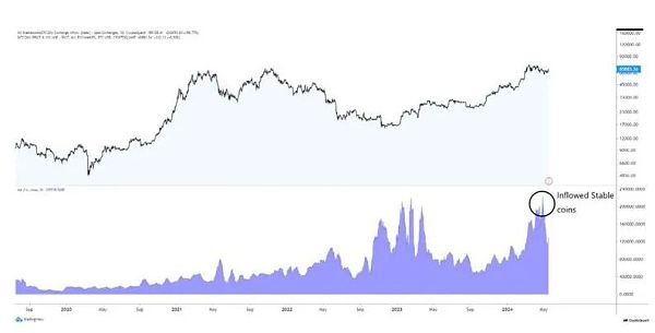 随着时间的推移,比特币的价格出现了多次波动,而蓝色区域表示进入市场的稳定币数量。值得注意的是,稳定币流入量在不同时间点显着增加,这通常与比特币的价格走势一致。