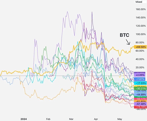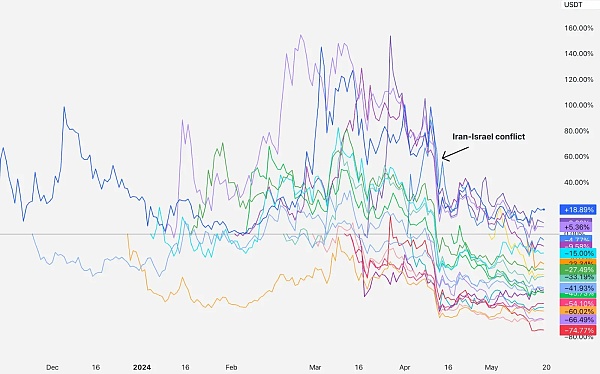 在最初的几个月里,这些代币的交易自上市以来大多持平,直到 4 月中旬。伊朗和以色列突然开始威胁第三次世界大战,市场暴跌。比特币价格回涨回来了,但这些代币却没有。