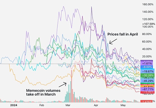 如果这是真的,那么我们应该看到的是:这些新代币发行的价格下跌,而二级市场则转向meme币。