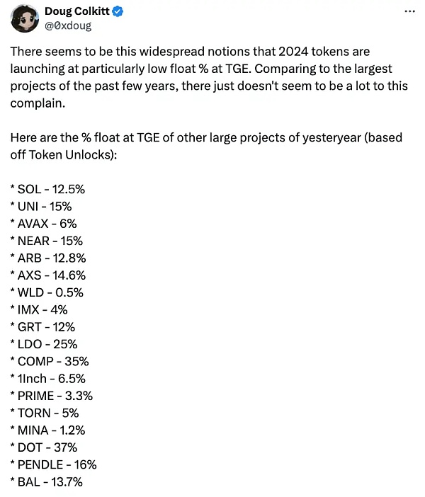 归功于 @0xdoug提取了这些数据。你猜对了,上一个周期这些代币在 TGE 的平均流通量是 13%。