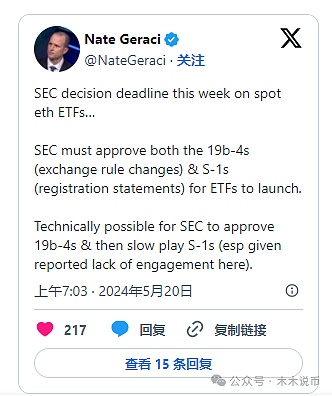 对此,ETFStore 总裁Nate Geraci 今(20)晨发推分析,SEC 必须批准19b-4 (交易所规则变更)申请文件和S-1 (注册声明)申请文件,以太坊现货ETF 才能推出,从技术上来说,SEC 有可能批准19b-4,但放慢S-1 的执行速度,尤其是考虑到SEC 缺乏积极参与度的话。