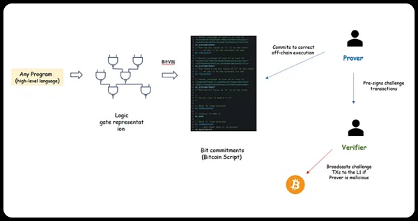 BitVM的方法涉及链下执行交易,其功能是通过欺诈证明在挑战窗口内的链上验证它们,这是一种类似于以太坊的optimistic rollup的机制。