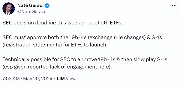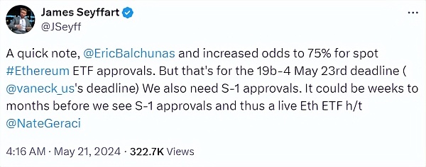 他写道:“简短说明,Balchunas和我将以太币现货ETF批准的机率提高到75%。但这是针对19b-4规则在5月23日的最后期限。我们还需要S-1批准。在我们看到S-1批准以及实际上线的以太币现货ETF之前,可能需要几周到几个月的时间。”