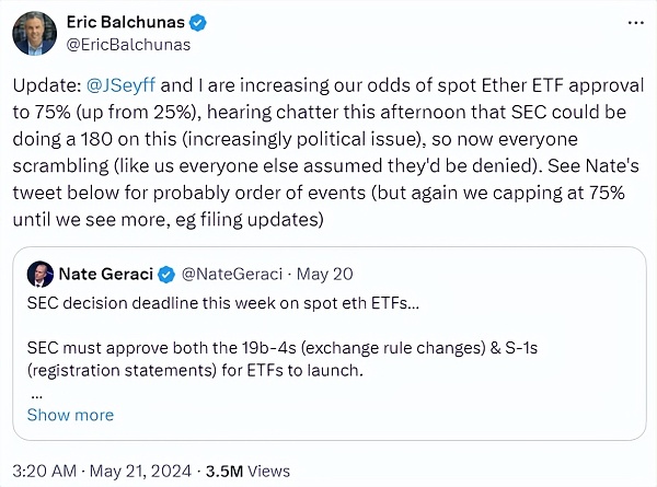 Balchunas罕见发文表示:“我将以太币现货ETF批准的机率提高到75%,从25%上调,今天下午听到一些传言说美国证监会可能会对这个(越来越政治化的议题)做出180度的大转变,所以现在大家都在紧急应对(像我们一样,其他人也都以为会被拒绝)。”