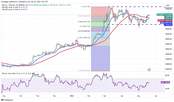 如果这种趋势持续下去,比特币可能会超出预期。目前,比特币交易价格在70000美元的几百美元范围内,20日均线为64371美元,RSI为正值,表明向上突破的可能性更大。克服68000美元的阻力位表明比特币价格有望升至73777美元,尽管该水平可能会引发强烈的看跌反应。