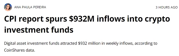 “有趣的是,资金流入是对周三低于预期的CPI报告的立即反应,本周后3个交易日占总流量的89%,凸显了我们认为比特币价格已与利率重新挂钩的观点期望。 ”