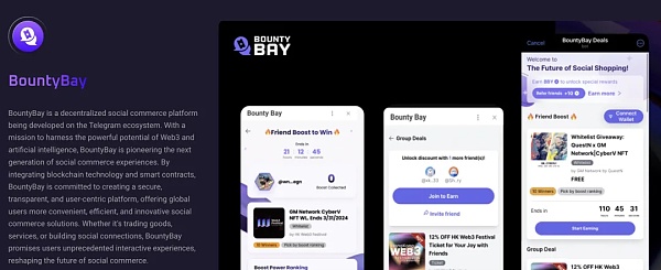 BountyBay 是一个在 Telegram 生态系统上开发的去中心化社交电商平台。以利用 Web3 和人工智能的强大潜力为使命,BountyBay 正在开创下一代社交电商体验。