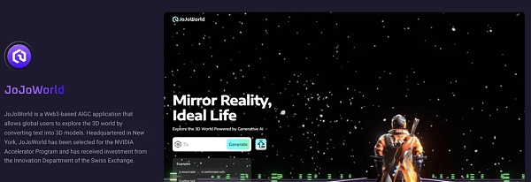 JoJoWorld 是一个基于 Web3 的 AIGC 应用程序,允许全球用户通过将文本转换为 3D 模型来探索 3D 世界。JoJoWorld 总部位于纽约,已被选入 NVIDIA 加速器计划,并获得瑞士交易所创新部门的投资。