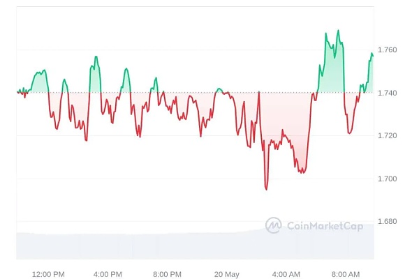 LDO 代币交易价格约为 1.76 美元,盘中上涨 1.02%。LDO 价格低于 50 天和 200 天指数移动平均线 (EMA),表明过去存在负交叉。如果价格升至这些均线上方,则预计会出现强劲的上涨趋势。