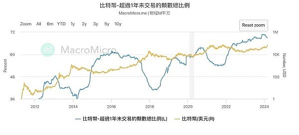 比特币的链上存货和交易见图表1,可以看到,比特币ETF批准之后,比特币一年未交易的币由70.72%下降到68.97%。减少了36,750个,而ETF进货了约8万个。表1的蓝线代表囤货,黄线代表交易。