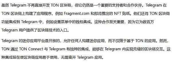 Telegram 是 TON 生态系统的重要组成部分。TON 区块链的第一个主要用例之一是 Telegram 自己开发的应用 Fragment.com。Fragment.com 允许你将你的 Telegram 用户名作为 NFT 购买。这是一项突破性的功能,因为它使你可以拥有你的社交媒体用户名,这是社交媒体历史上的首次。这种概念类似于在区块链上拥有有价值的房地产。例如,整个 Telegram 平台上只有一个用户名 "@crypto",你可以与这个用户名关联一个小型应用程序。
