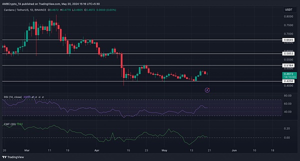 然而,趋势在过去 24 小时内发生了变化,ADA 下跌了 1.7%。根据CoinMarketCap 的数据,截至撰写本文时,ADA 的交易价格为 0.4676 美元,市值超过 166 亿美元。