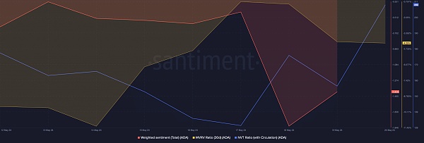 ADA 的加权情绪也下降,这意味着围绕该代币的看跌情绪在市场上占主导地位。另一个看跌指标是 MVRV 比率,该比率也在 5 月 19 日下降。
