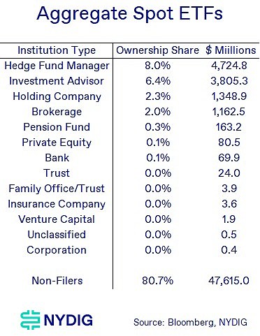 对冲基金是现货ETF中最大的所有者类别之一,持有价值高达47亿美元,占现货ETF总所有权的8.0%。但需要注意的是,这一数据基于3月29日的季度末持股情况,仅代表当时的所有权状况。鉴于对冲基金资金流动的迅速变化,当前的所有权水平可能与一季度末已有较大差异。