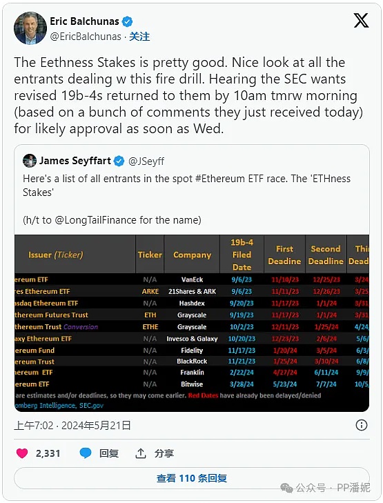 Balchunas 报告称,SEC 希望在 5 月 21 日上午 10 点之前将修改后的 19b-4 表格返还给他们,“以便最早在周三获得批准”。