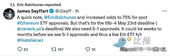 另一位彭博 ETF 分析师James Seyffart也在社交媒体平台上发布了他的评论。他表示:“本周现货以太坊 ETF 的批准情况正在好转。我们将现货以太坊 ETF 批准的几率提高到 75%。但这是 5 月 23 日 19b-4 的截止日期, (Vaneck的截止日期)我们还需要 S-1 批准,我们可能需要几周到几个月的时间才能看到 S-1 获得批准,从而看到以太坊 ETF 上线”。