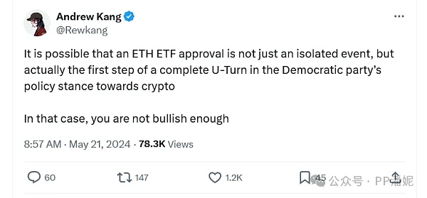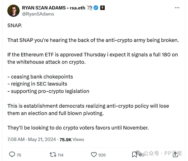 分析师Balchunas评论说,围绕加密货币的政治态度似乎正在快速改变,尤其是在接近美国大选的时候,加密货币正变得越来越政治化。虽然不完全确定,但他认为拜登政府可能希望在加密货币问题上表现得不那么强硬。美国SEC必须在5月23日前做出决定,是批准还是拒绝包括VanEck在内的几家公司的现货以太坊ETF申请。