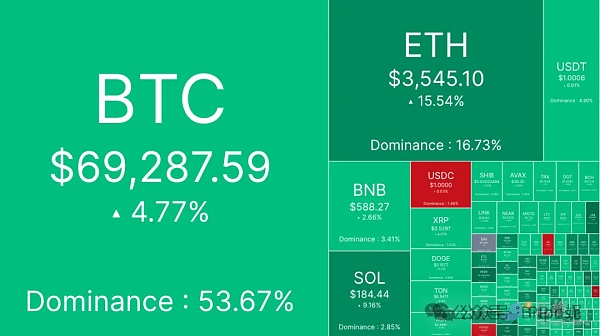 比特币价格也有所反弹,重返70000美元大关,这是自4月中旬以来的首次。与日低相比上涨了4000美元,尽管截至发稿时其价格再次跌至70000美元以下,但24小时内的涨幅接近5%。