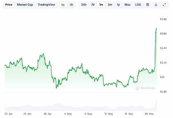 CoinGecko的数据显示,以太坊在过去24小时内上涨了19.4%,至3,685美元,这是自4月9日后所达到的最高价。