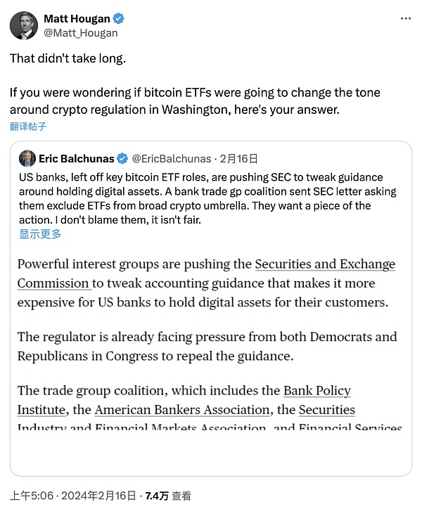 这并非仅是猜测。在现货比特币 ETF 推出之时,一系列银行游说机构(银行政策研究所、美国银行家协会、证券业和金融市场协会以及金融服务论坛等等)曾联合向 SEC 发出了一封反对 SAB 121 的信函。我当时也曾在 X 上解释过:“如果你想知道比特币 ETF 是否会改变华盛顿对加密货币监管的态度,这里有你的答案。”