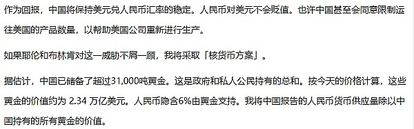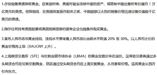 我的威胁是宣布人民币与黄金挂钩。以下是中国如何实现这一结果:
